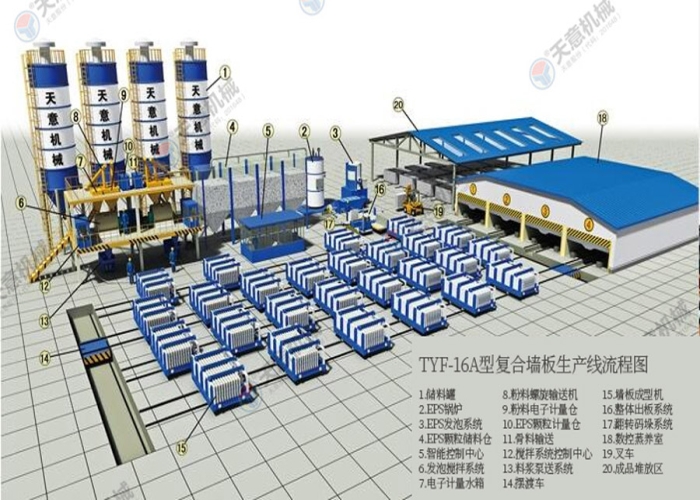 TYF-16A型復(fù)合墻板生產(chǎn)線是天意機(jī)械公司綜合國(guó)內(nèi)外技術(shù)經(jīng)驗(yàn),開發(fā)研制的新型墻體板材生產(chǎn)線。復(fù)合墻板生產(chǎn)線主要分為配料系統(tǒng)、攪拌系統(tǒng)、發(fā)泡系統(tǒng)、數(shù)控配電系統(tǒng)、墻板成型系統(tǒng)、料漿泵送系統(tǒng)、EPS預(yù)發(fā)系統(tǒng)、液壓循環(huán)系統(tǒng)、整體出板系統(tǒng)。