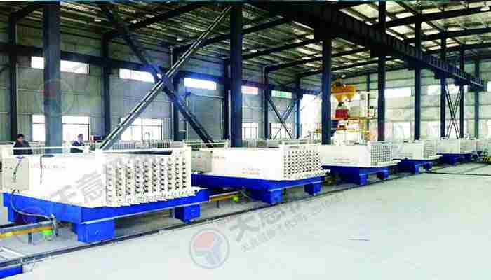 TY12型墻板生產線包括:墻板成型機、整體穿抽管系統、發泡系統、水箱、電子計量儲料倉、螺旋上料輸送機、儲料罐、螺旋輸送機、EPS熟化料倉、硫化干燥床、EPS預發機、數控配電室、發泡攪拌機、整體出板系統、叉車、成品堆放區、擺渡車。